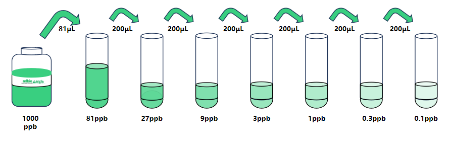 試劑盒中取出標準品,準備7個試管,先將1000ppb標準品(200µL)按需吸取一定量用1×稀釋液稀釋至81ppb(例:81µL的標準品母液+919µL的1×稀釋液,制備得到1000μL的6ppb濃度標準品),隨后在6個試管中分別加入400μL的1×稀釋液,在這6個單獨的試管中將81ppb標準品依次3倍倍比稀釋至7個梯度,共配制7個濃度的標準品,依次為:81ppb、27ppb、9ppb、3ppb、1ppb、0.3ppb、0.1ppb,從最高濃度標準品溶液中吸取200μL標準品到下一個試管中,輕輕吹打混勻,以此類推進行標準品的倍比稀釋(如圖所示),1×稀釋液用作零濃度標準品(0ppb)。