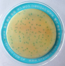 呈藍(lán)綠色的菌落為阪崎腸桿菌。出現(xiàn)陽(yáng)性菌落的樣本,最好用其他更為可靠的方法進(jìn)行驗(yàn)證,或者至少再取樣重復(fù)檢驗(yàn)一次。