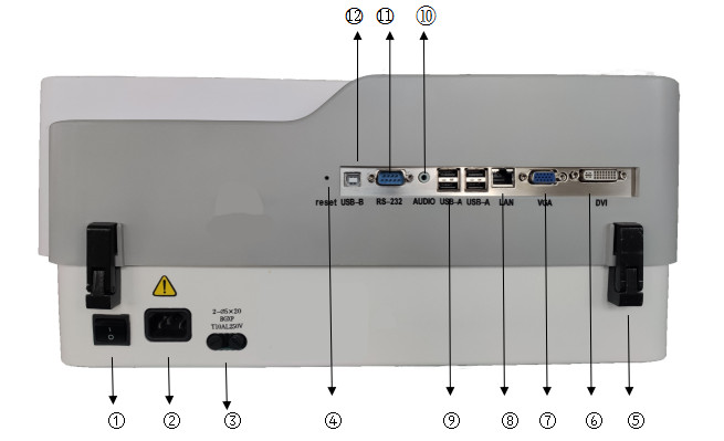 ①儀器電源開關:打開或關閉儀器電源。